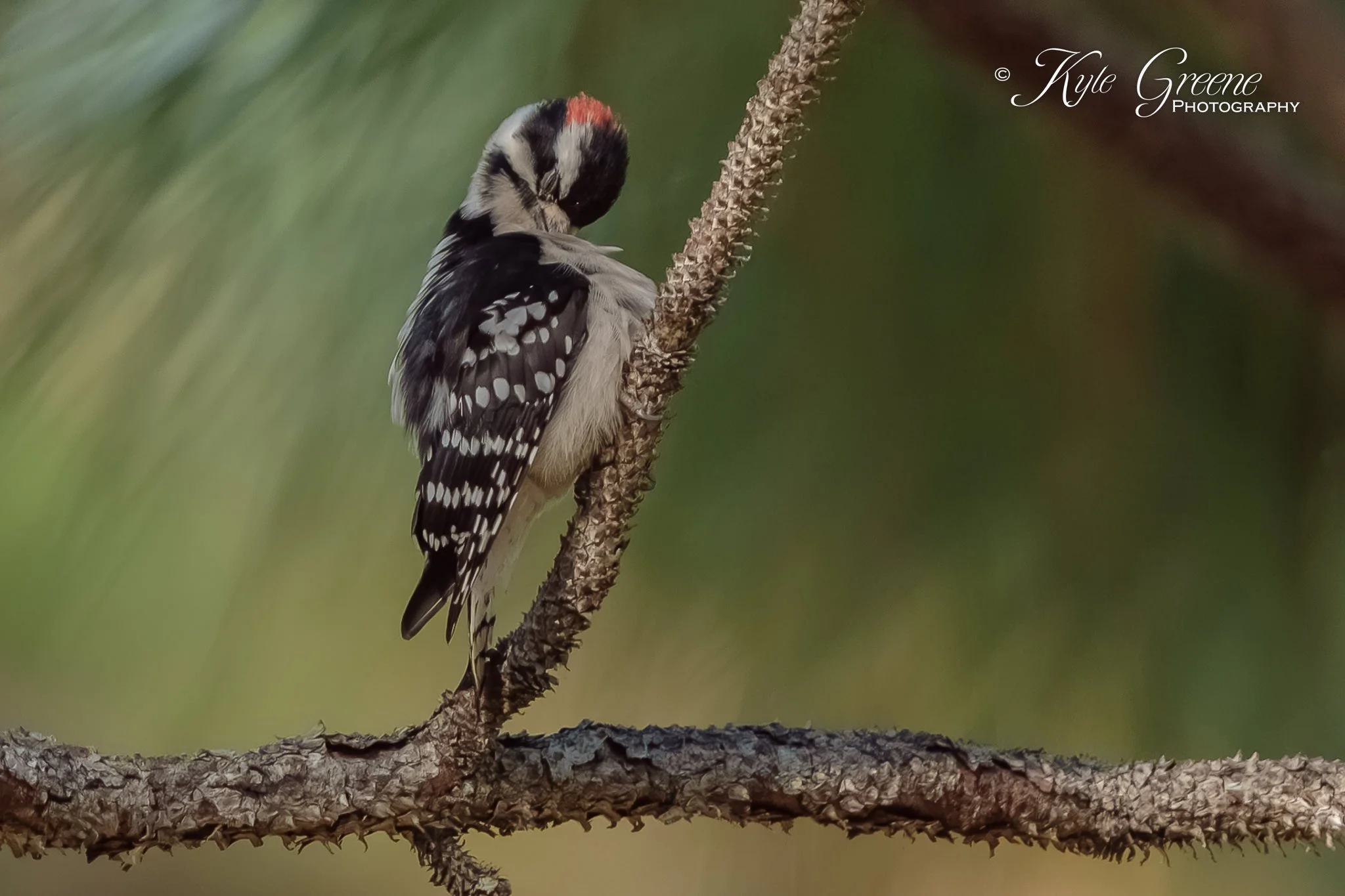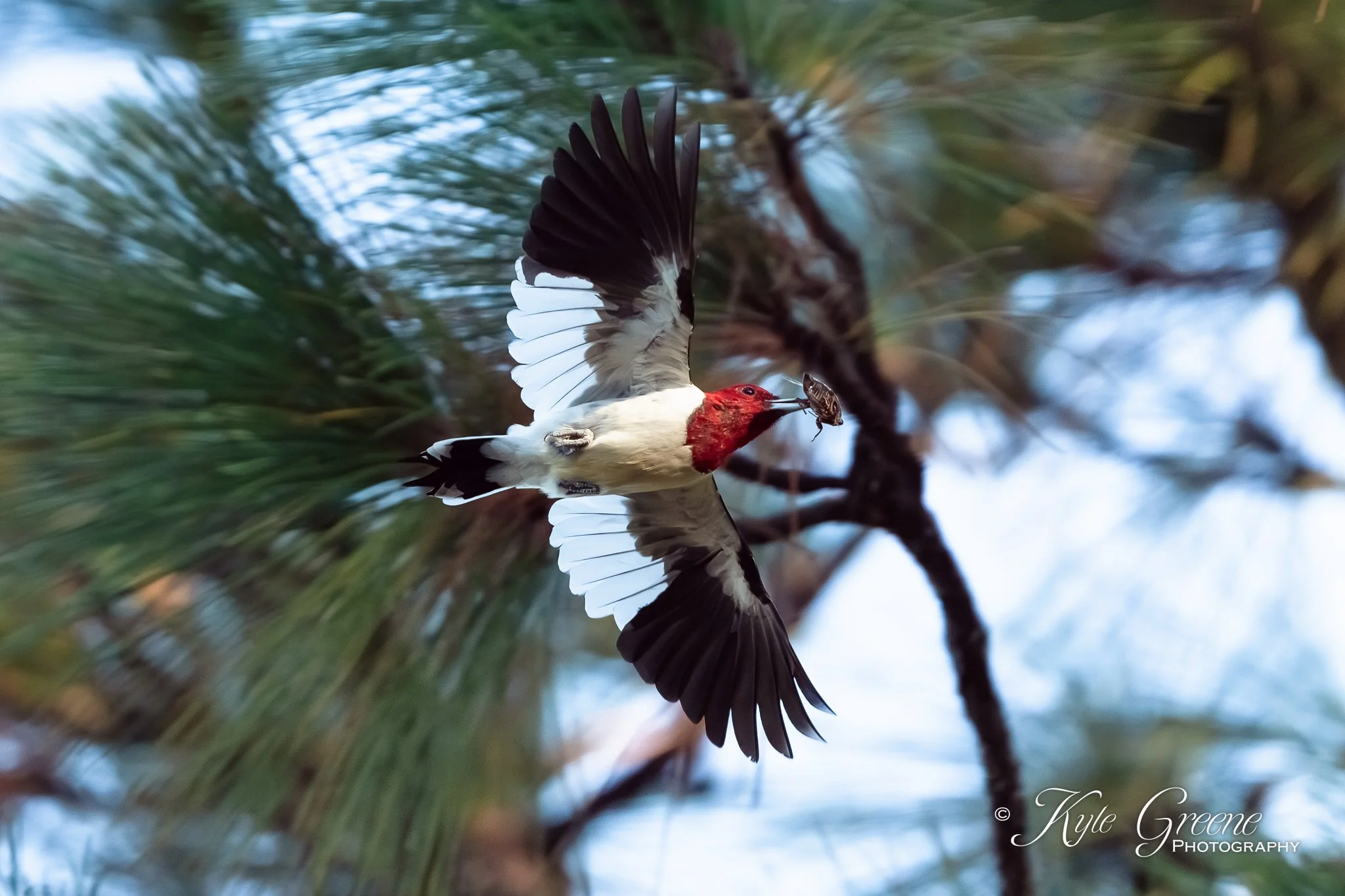 A juvenile Red Headed Woodpecker takes off with an acorn