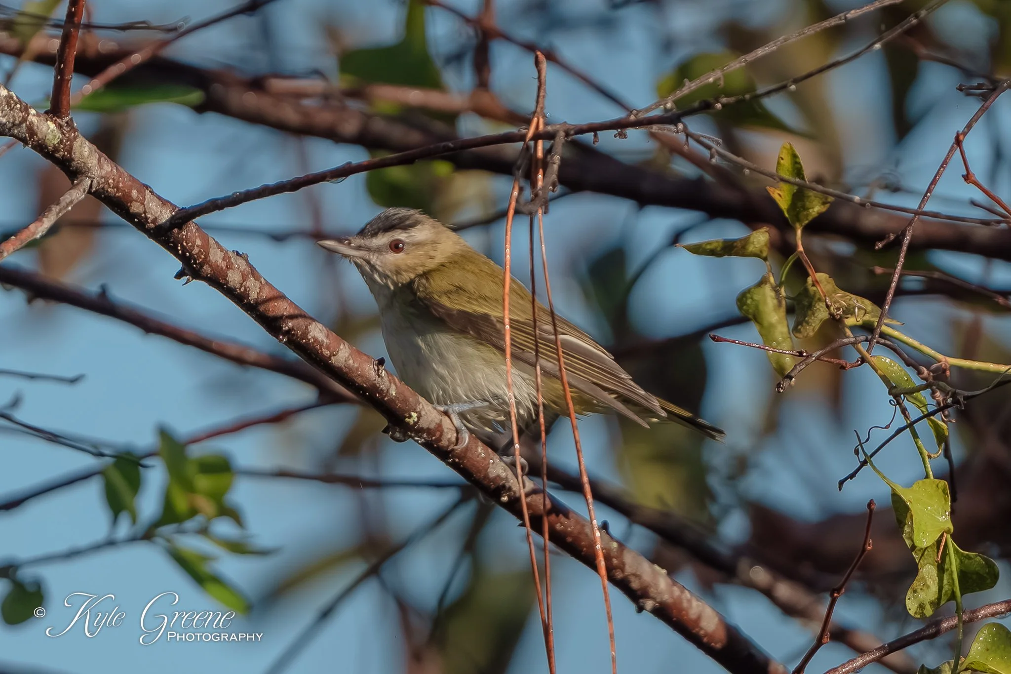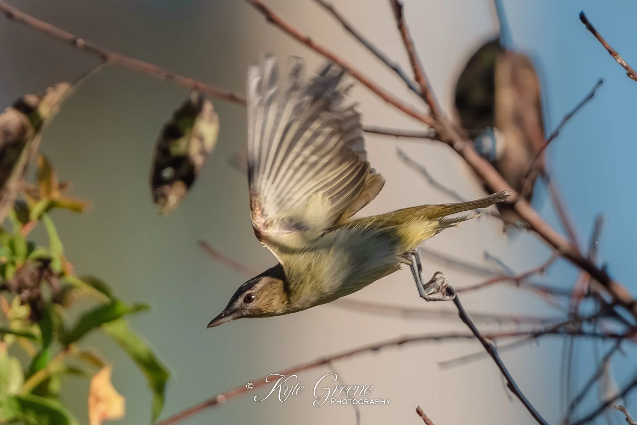 Not staying put for long, the Red-eyed Vireo flew down towards the ground