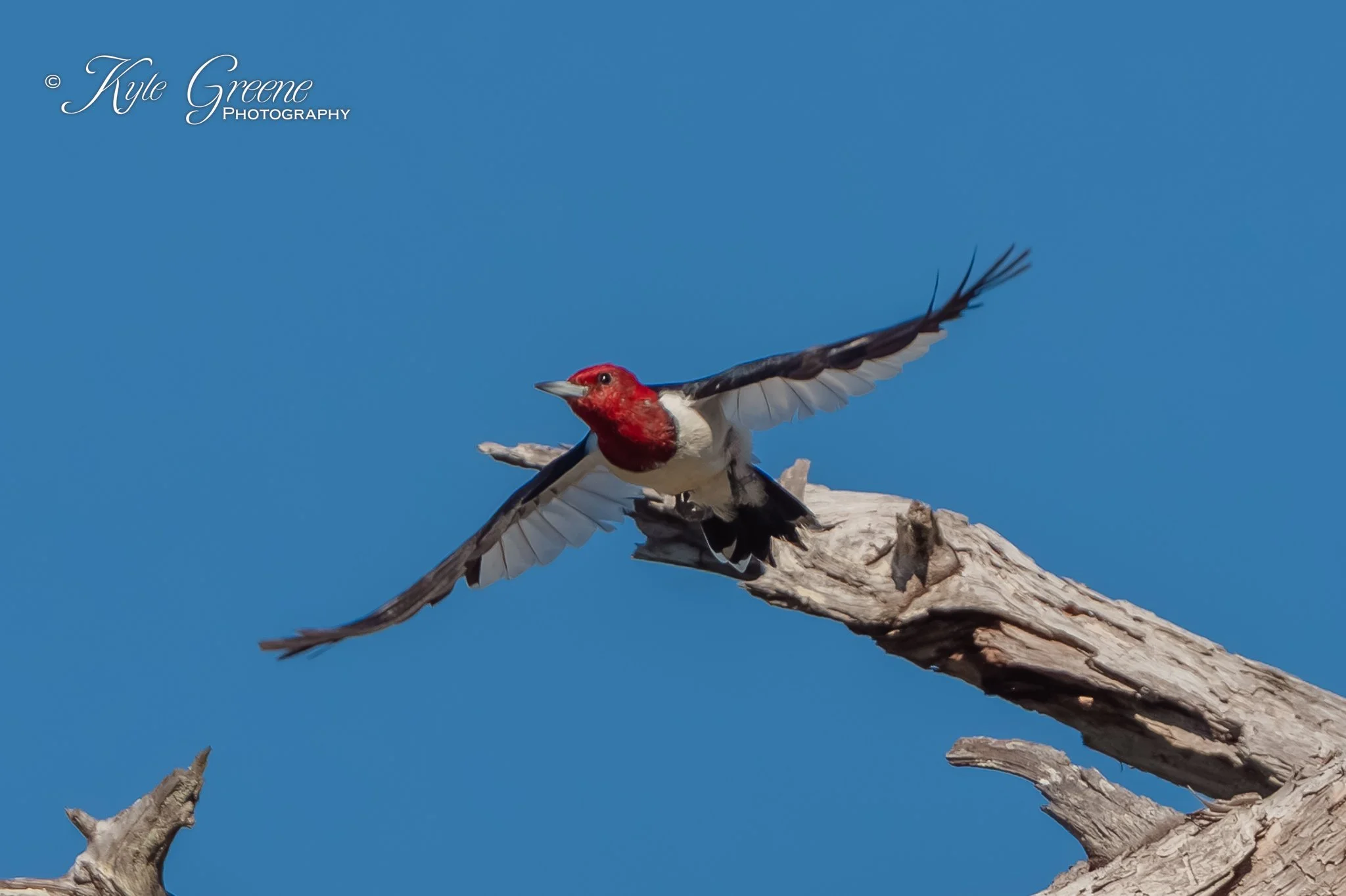Moving on to another perch, the Red-headed Woodpecker takes flight
