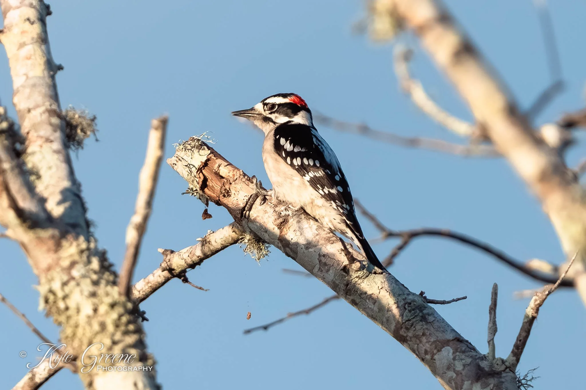 A little Downy Woodpecker looking for bugs before the sun goes down