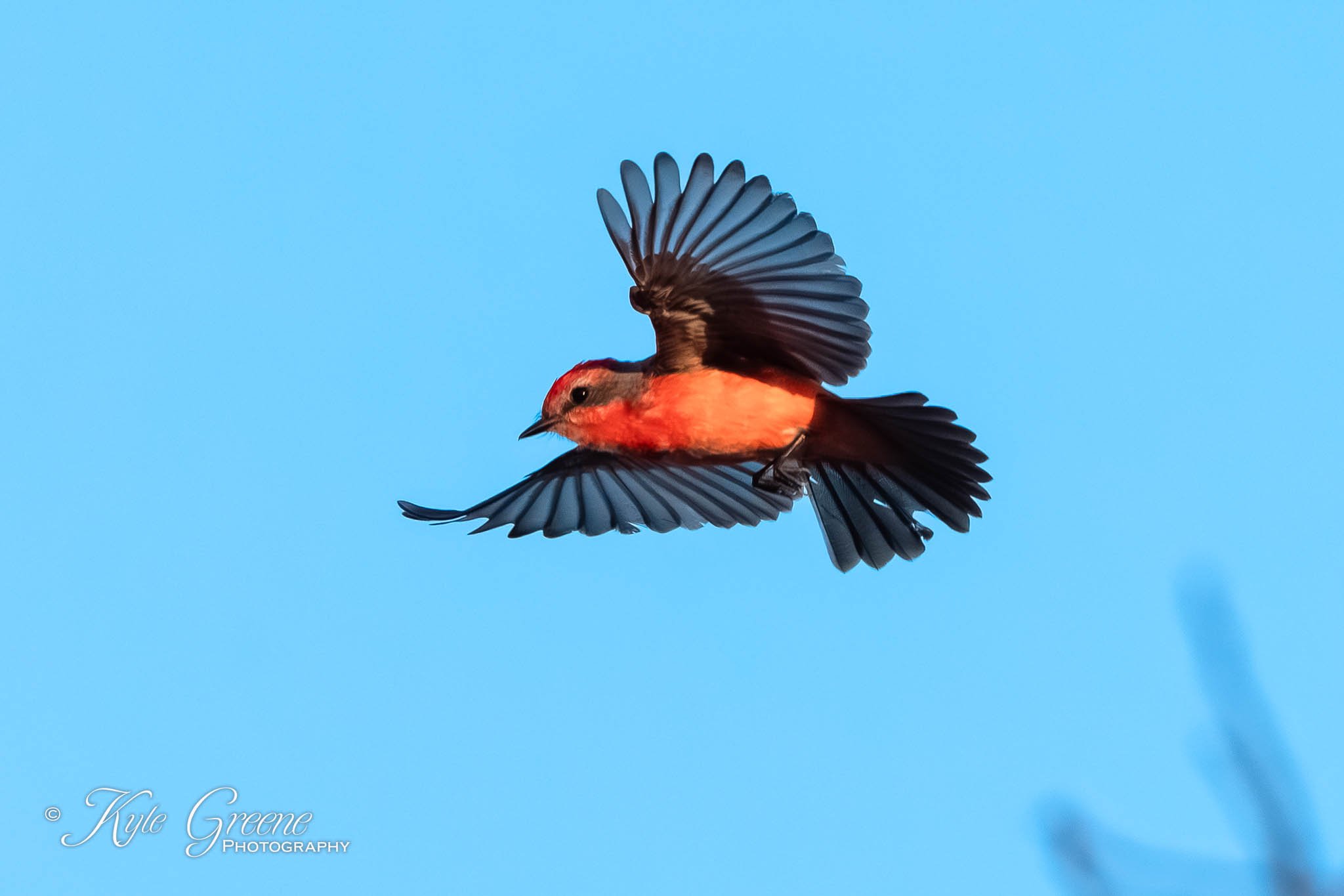 The late afternoon light gives a bit of an orange coloration to the Vermillion Flycatcher