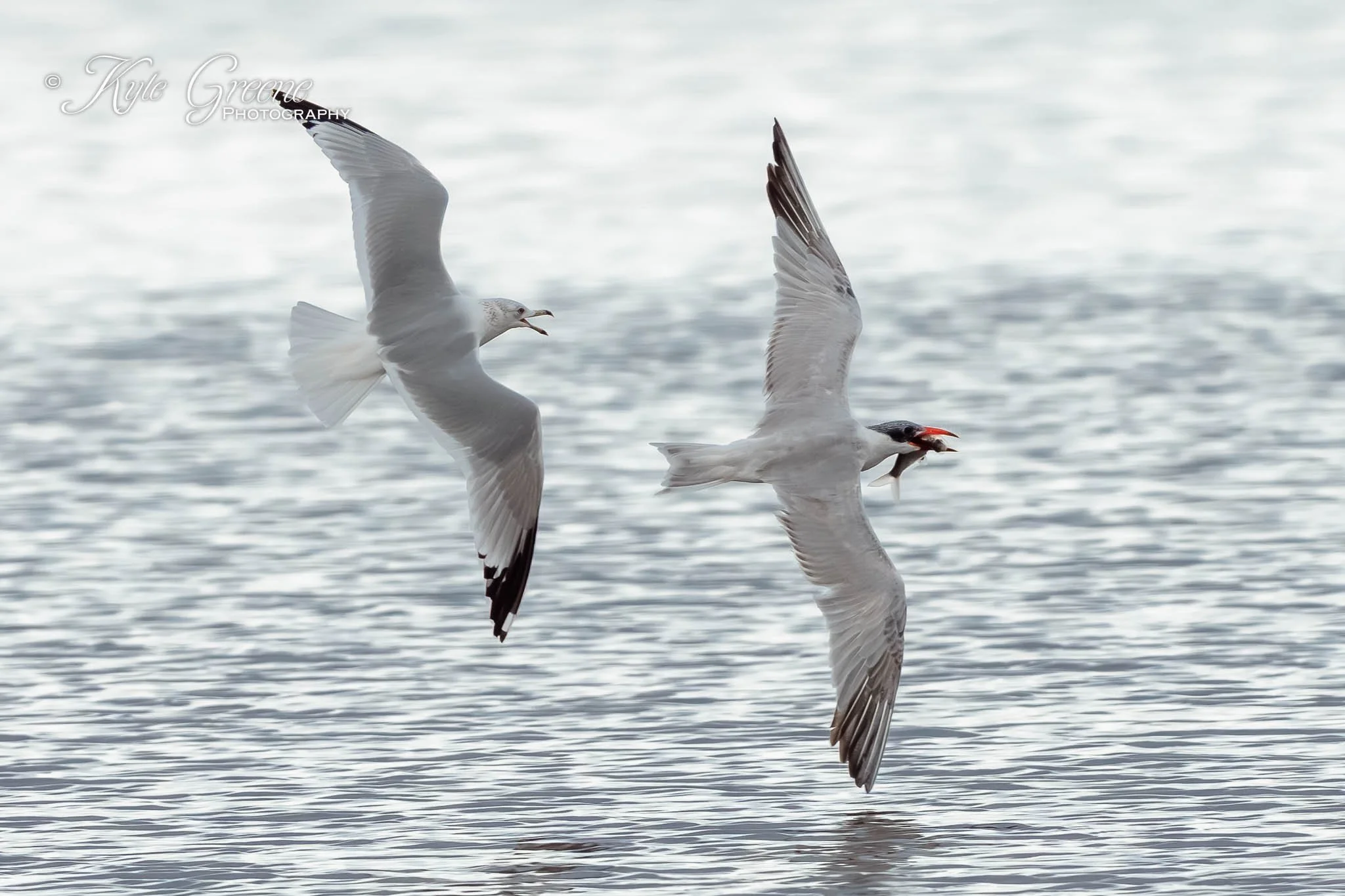 It didn’t take long for the Caspian Tern to get chased by a Ring-billed Gull that wanted to seal its fish