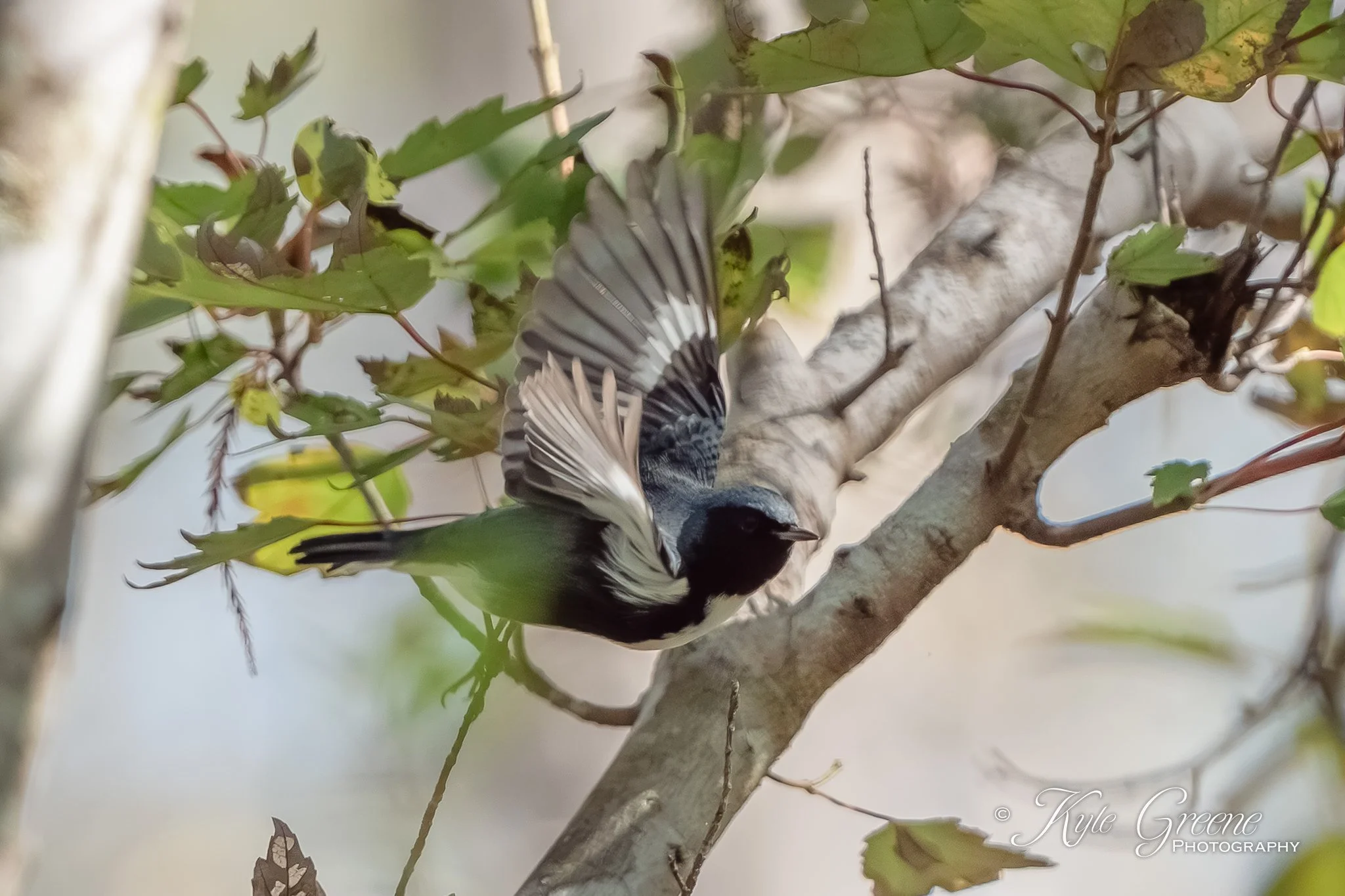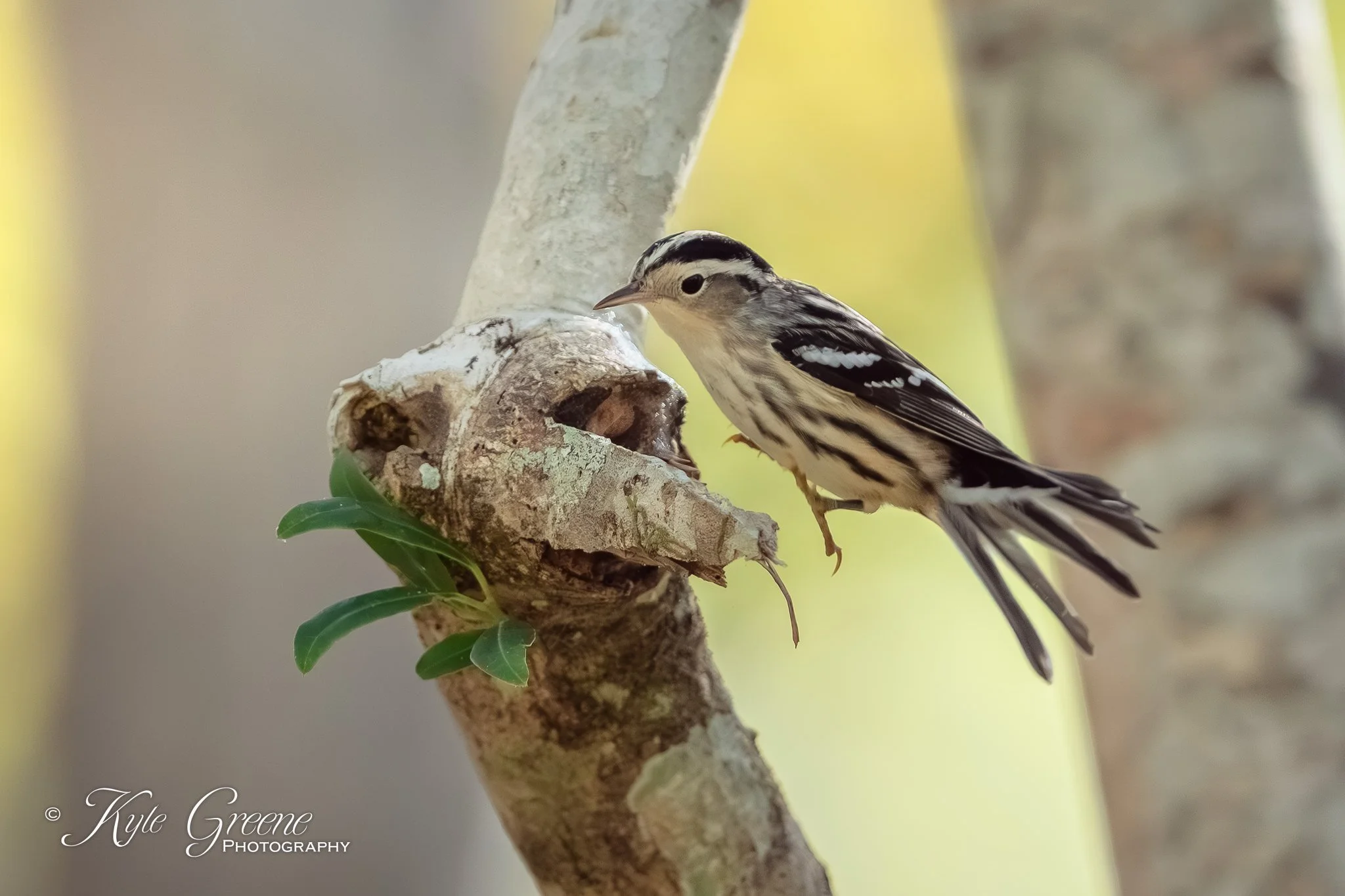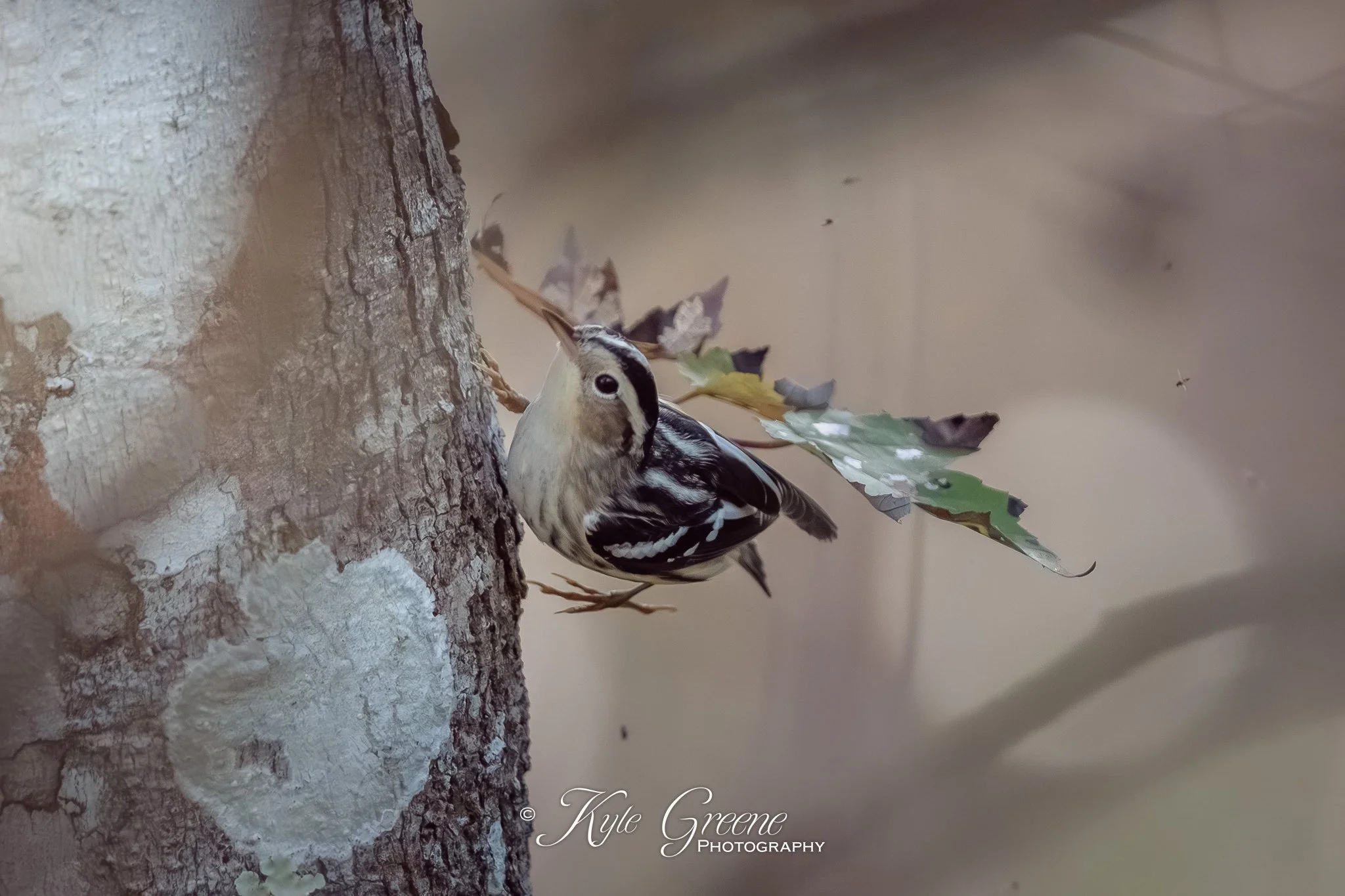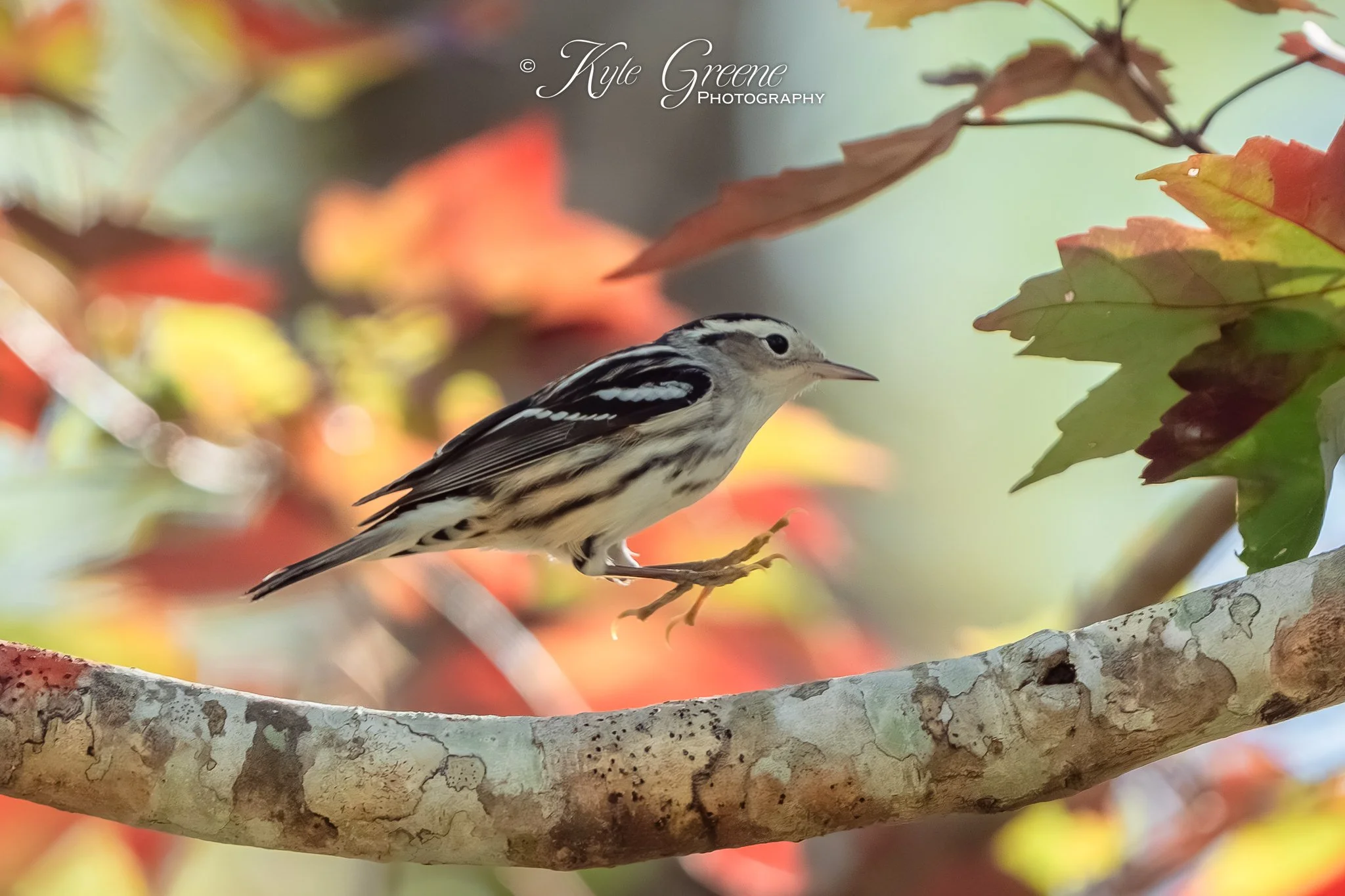Nice fall leaves behind the Black and White Warbler jumping on a tree