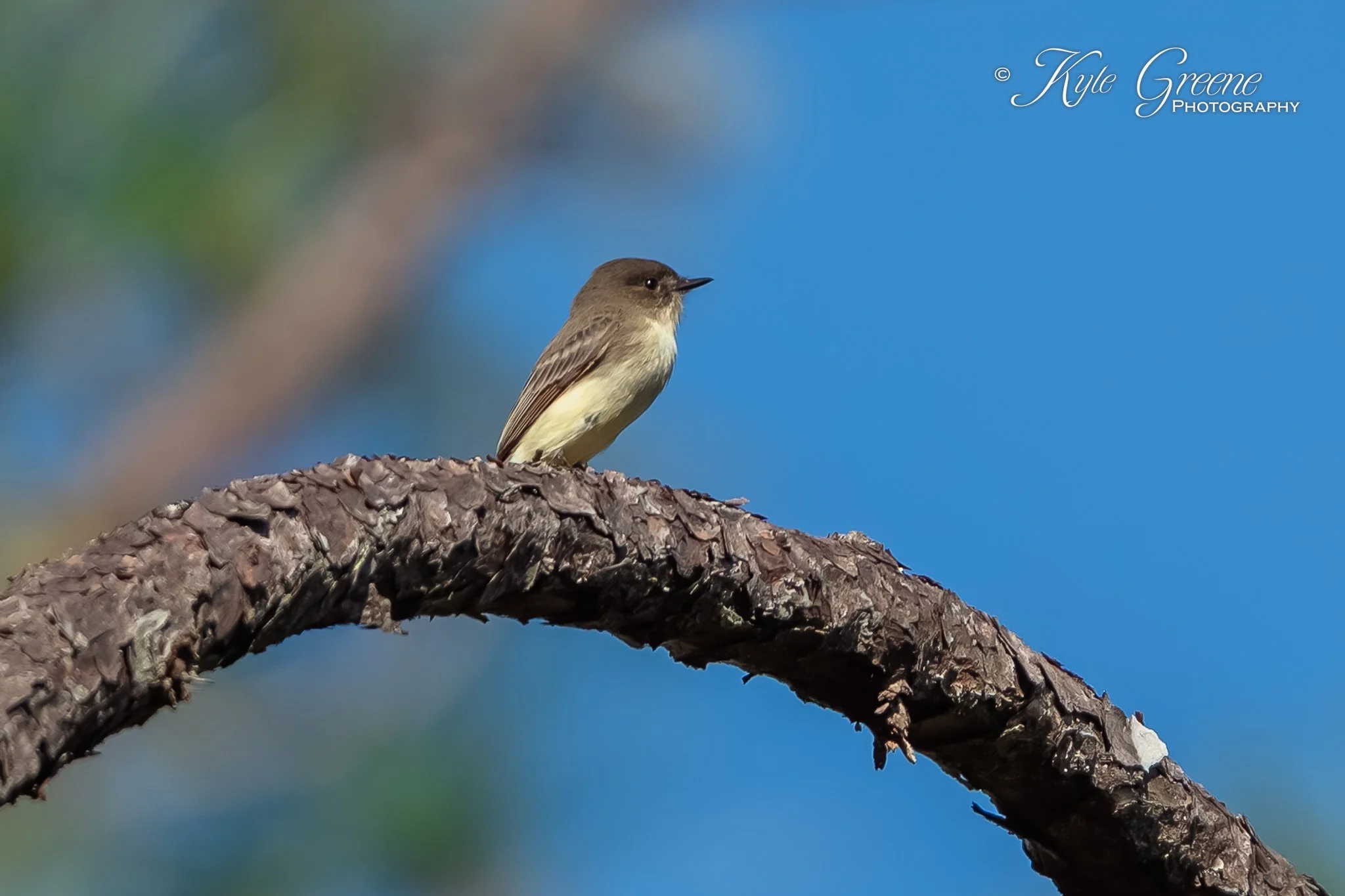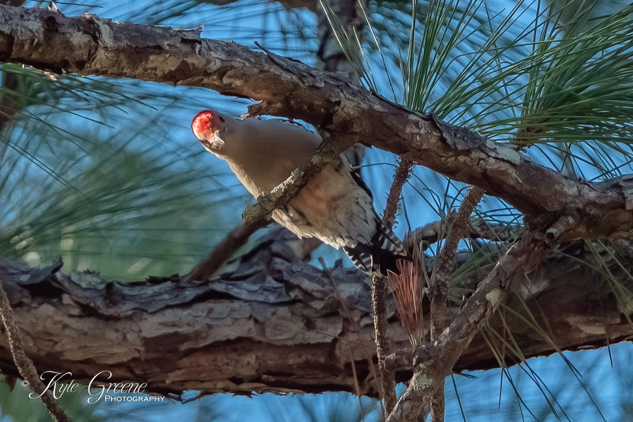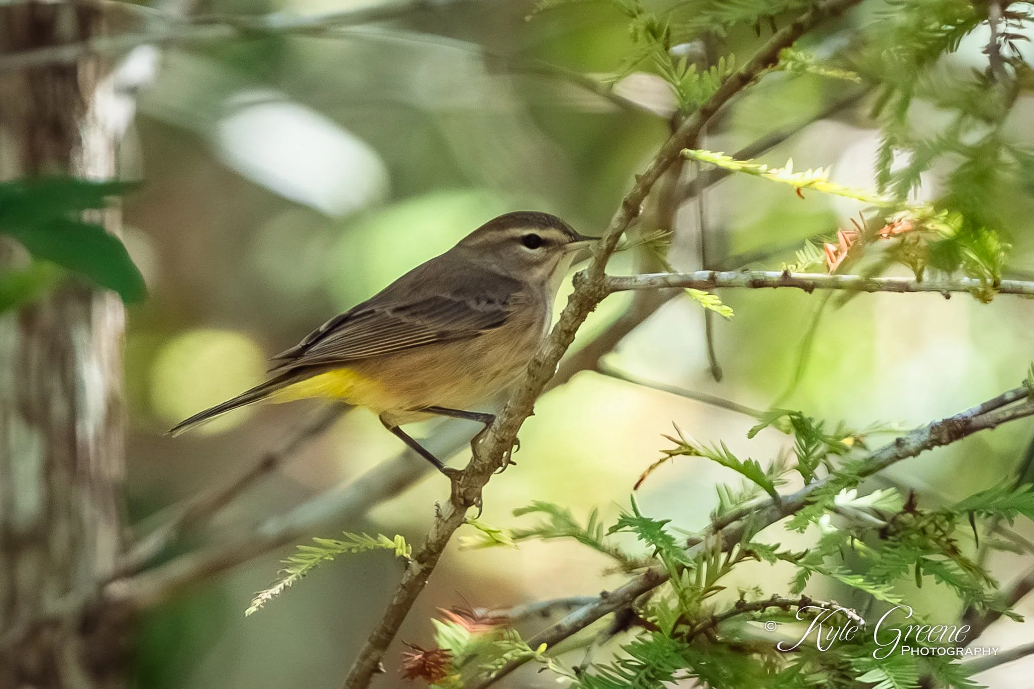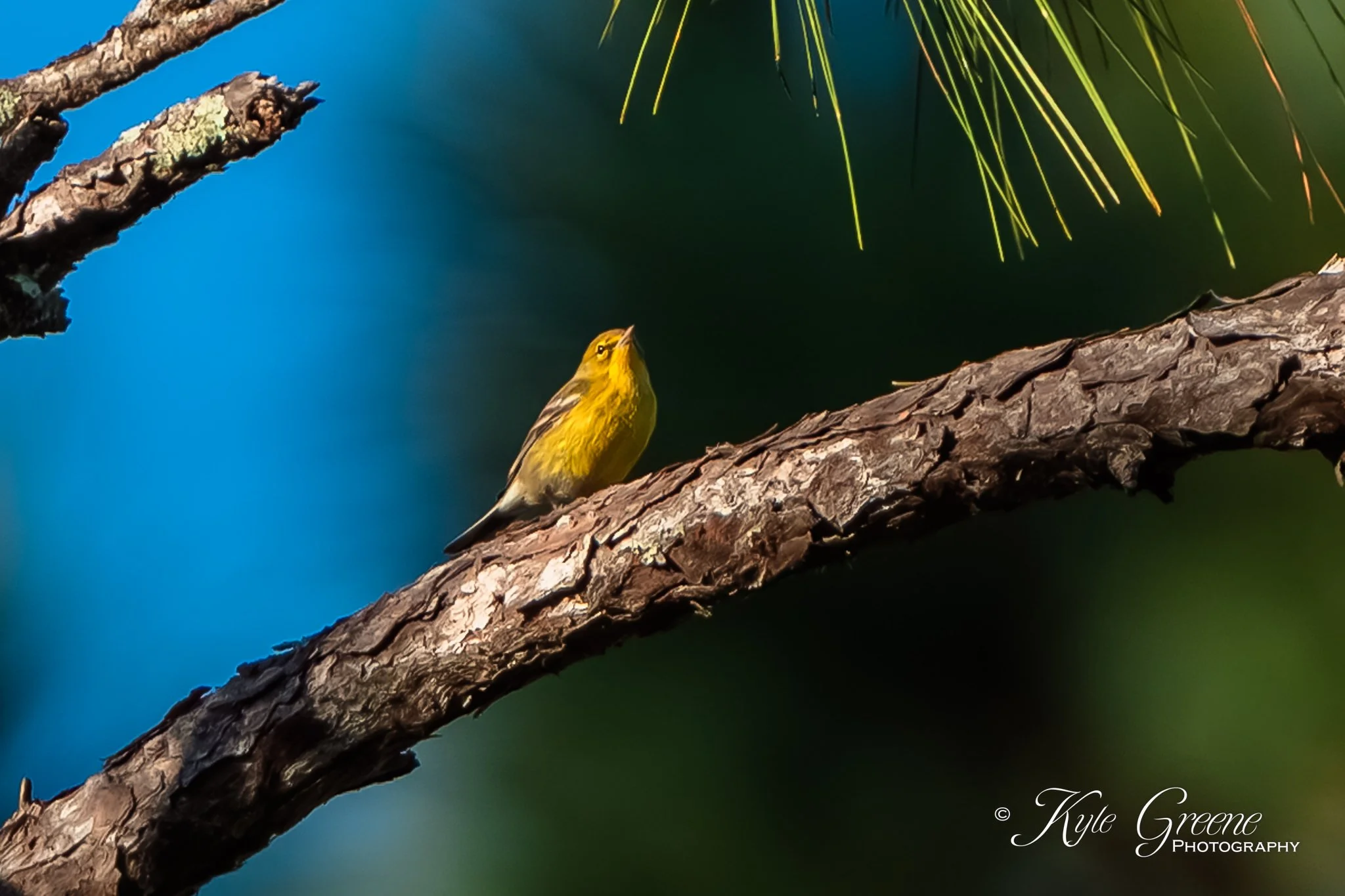 A little Pine Warbler that briefly flew into some beautiful light at the top part of a pine tree