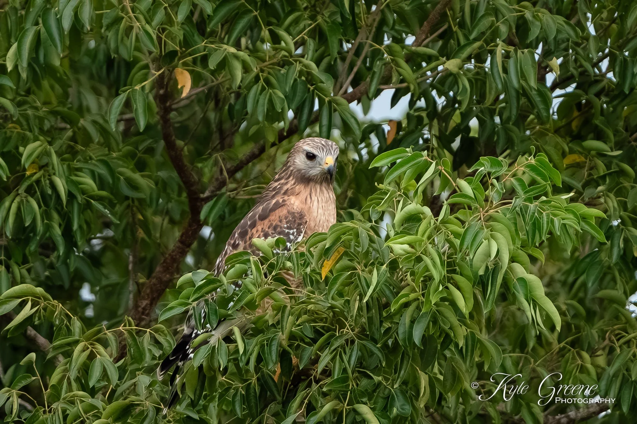 Red-shouldered Hawk watching from its hiding spot near the top of a tree
