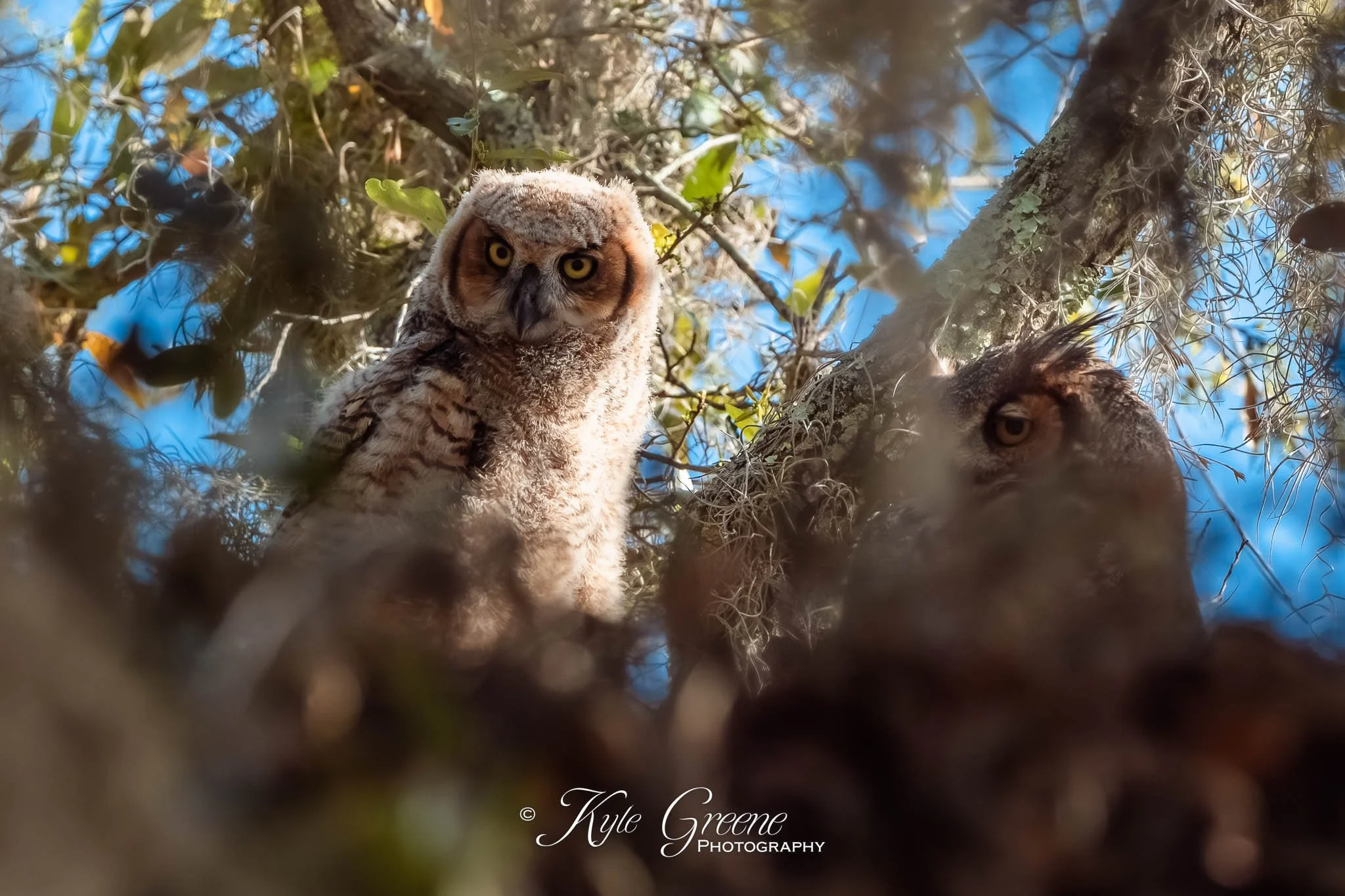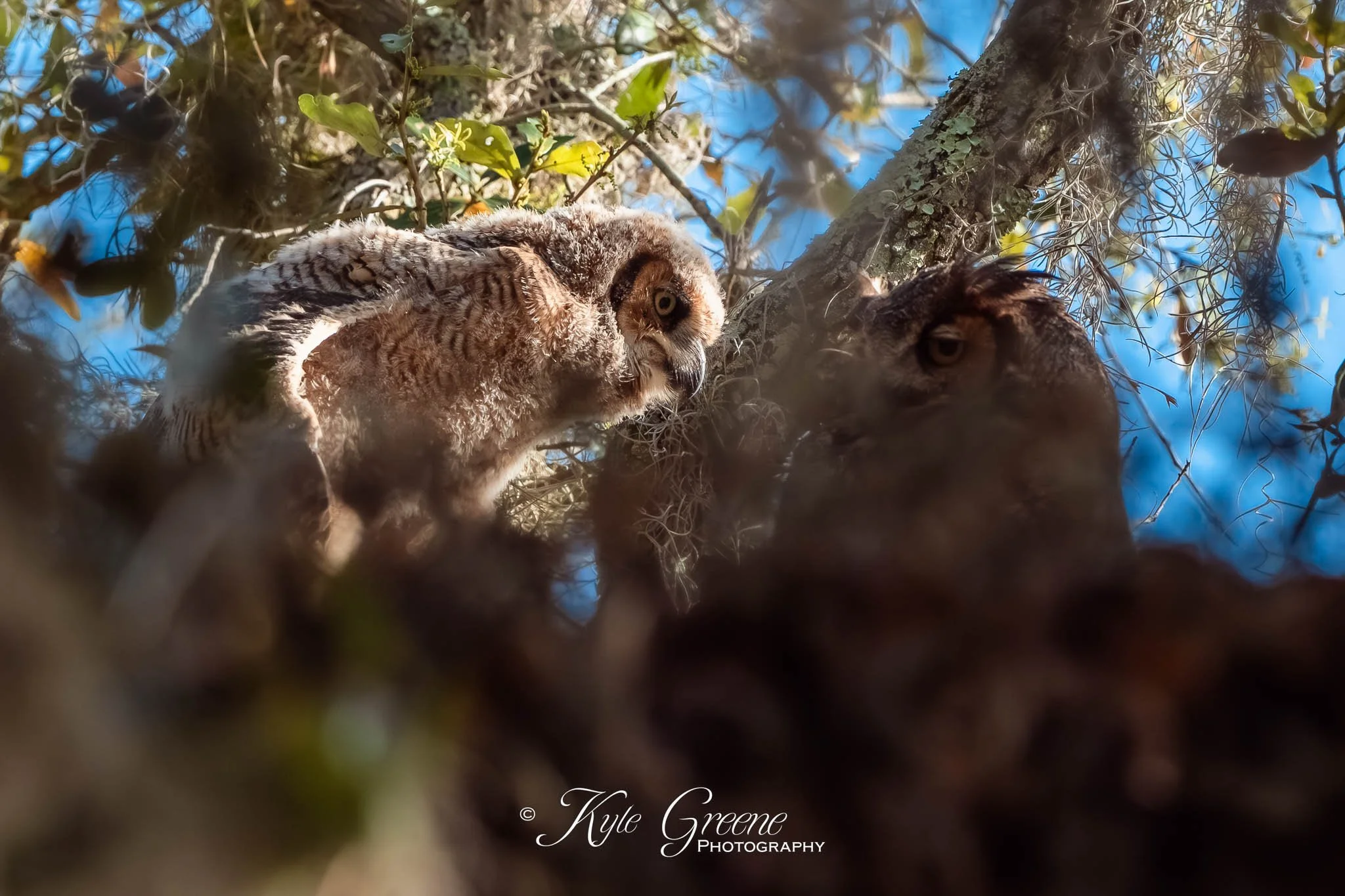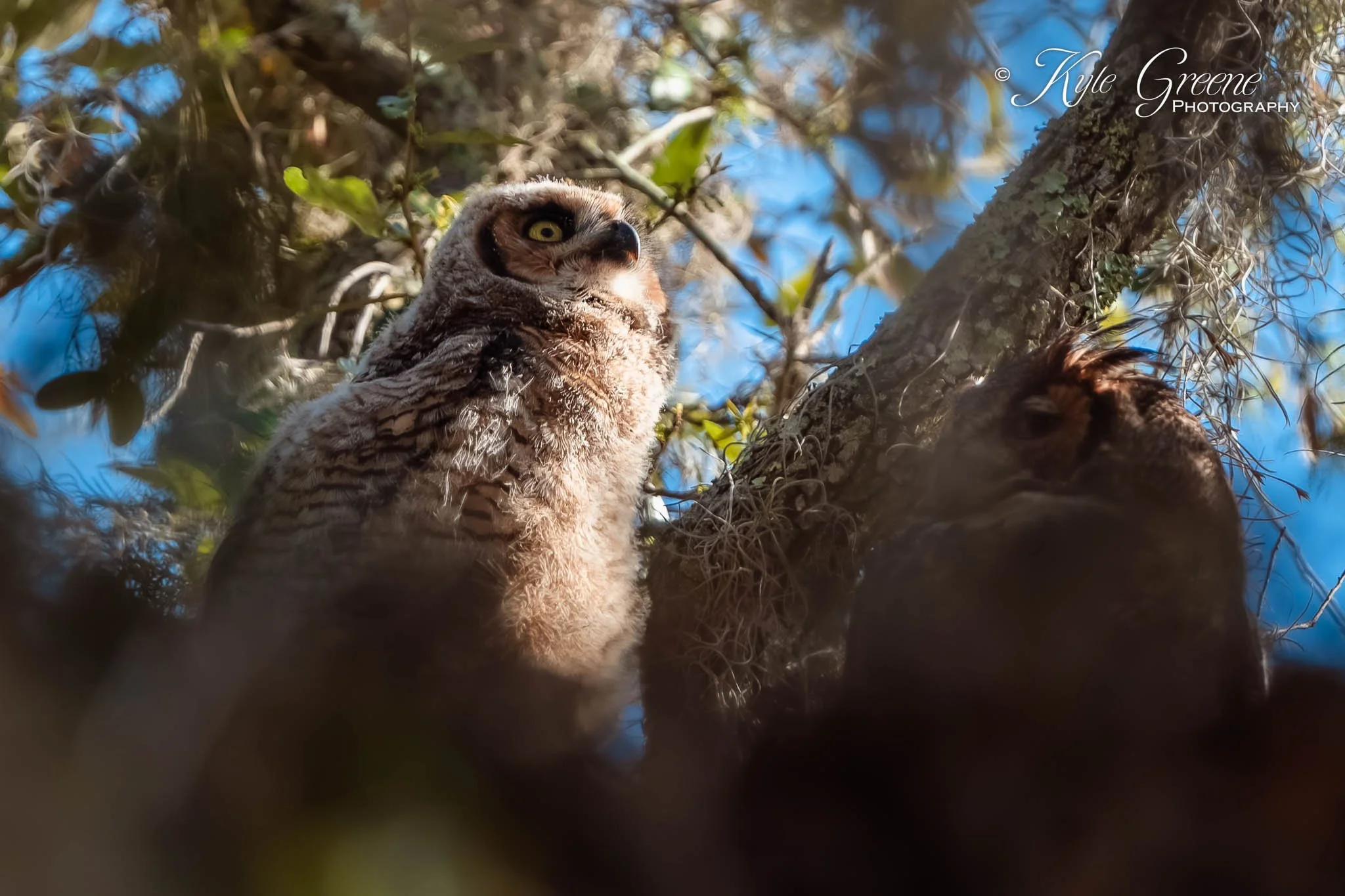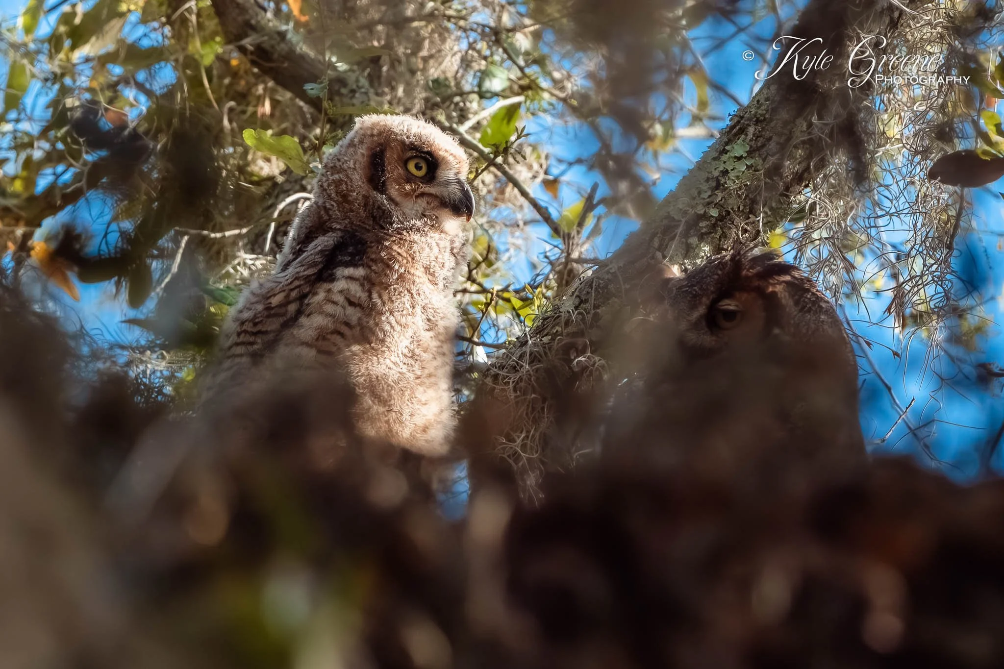 Baby Great Horned Owl with mom sitting right there in the shadows