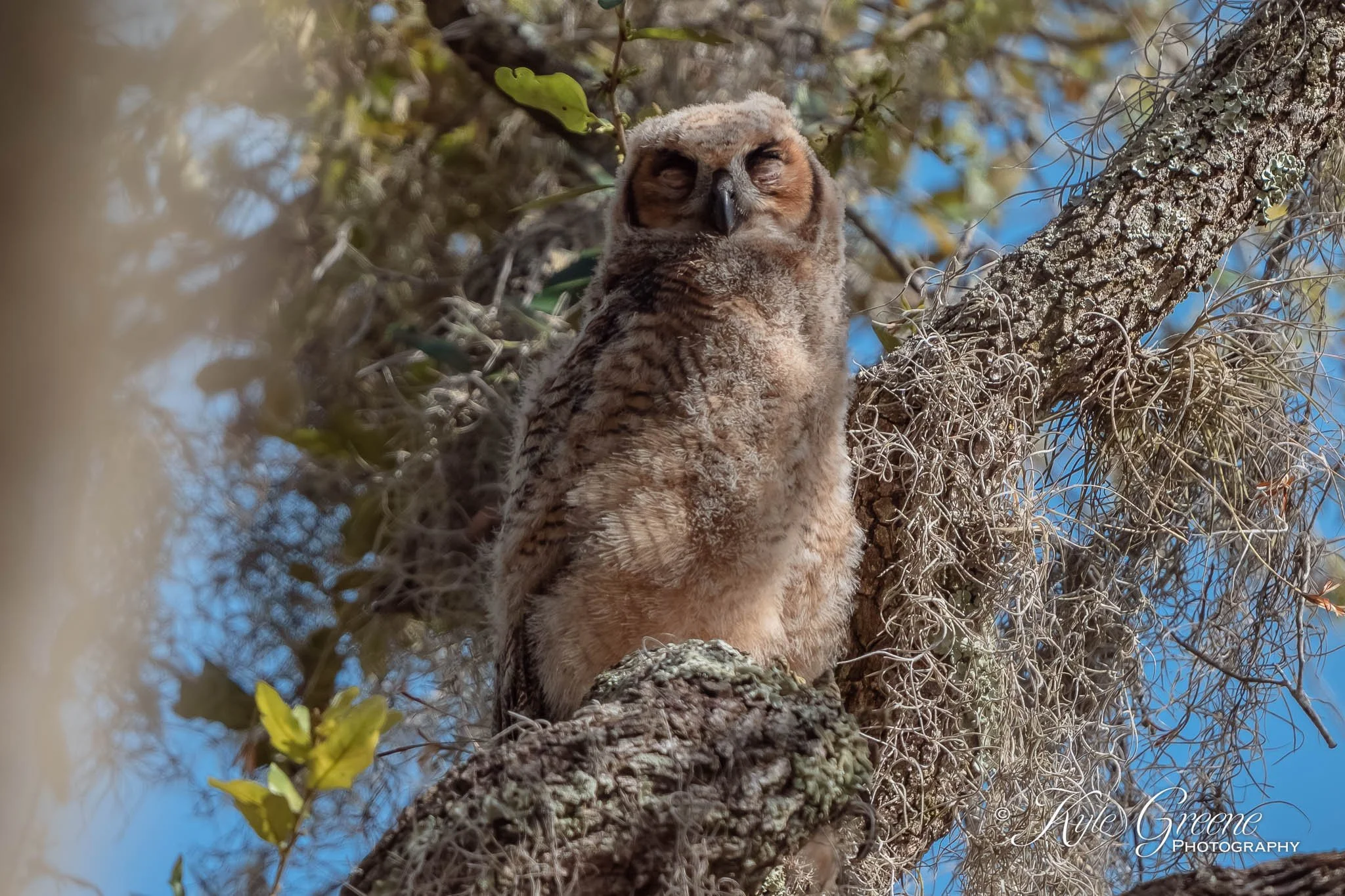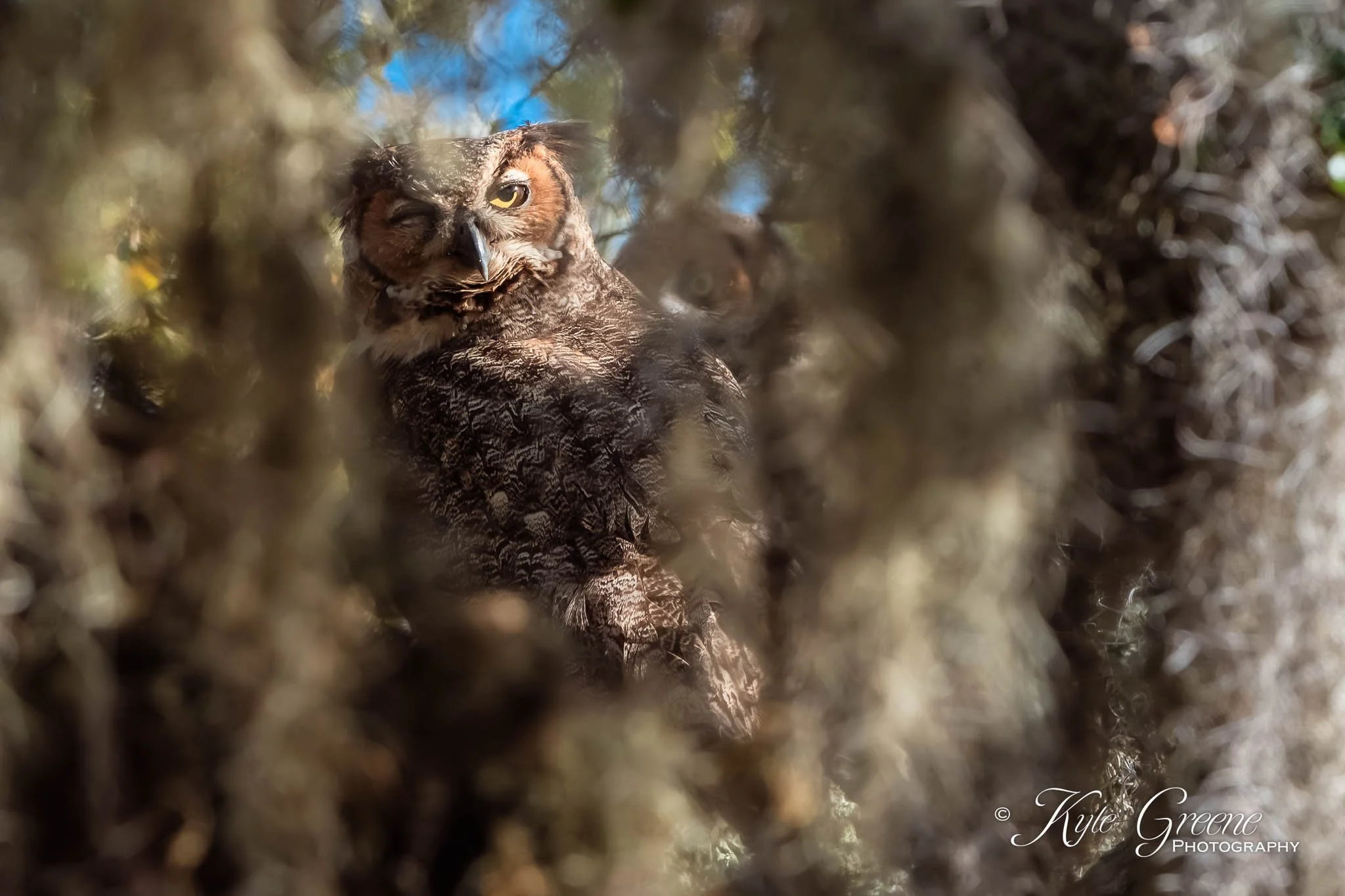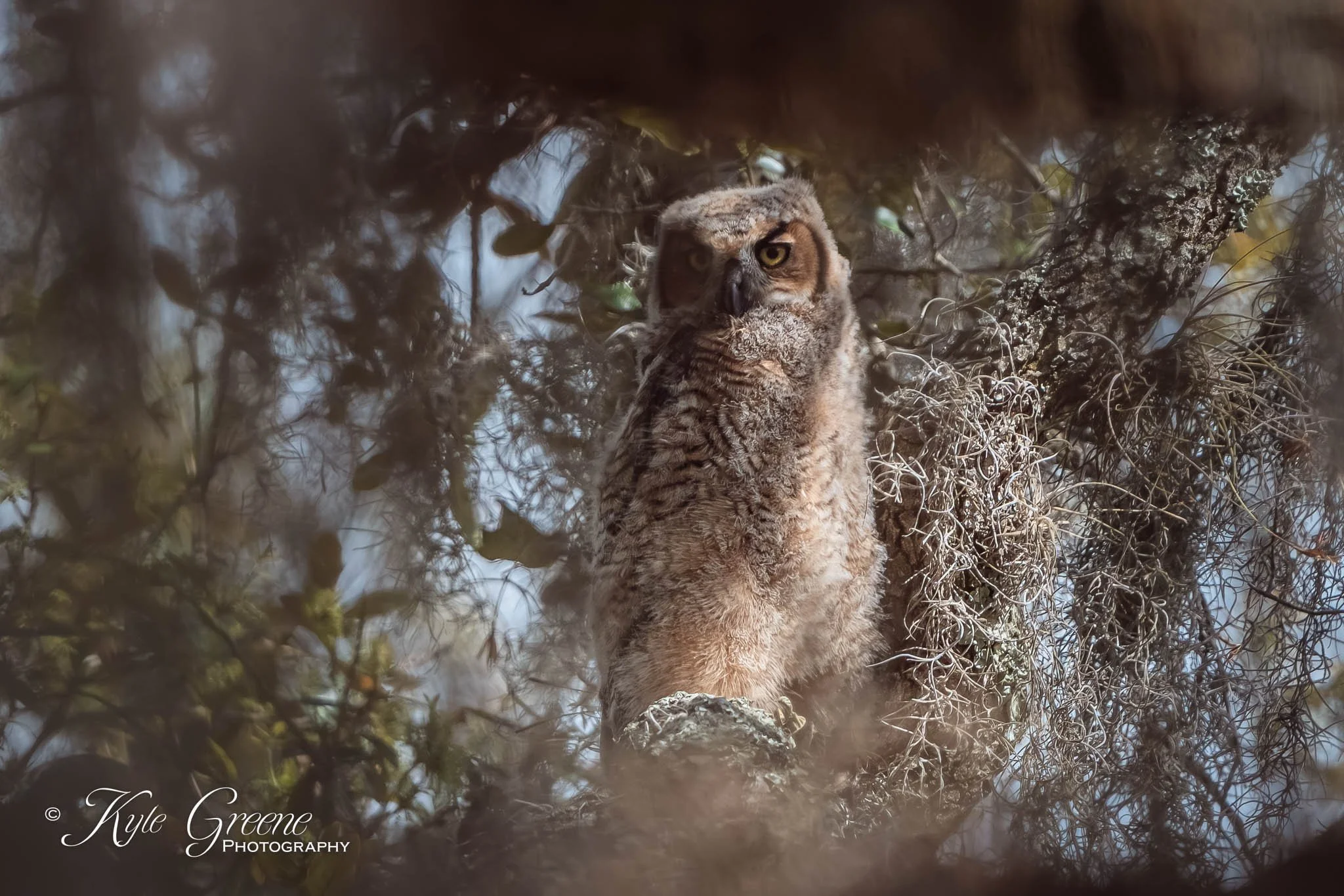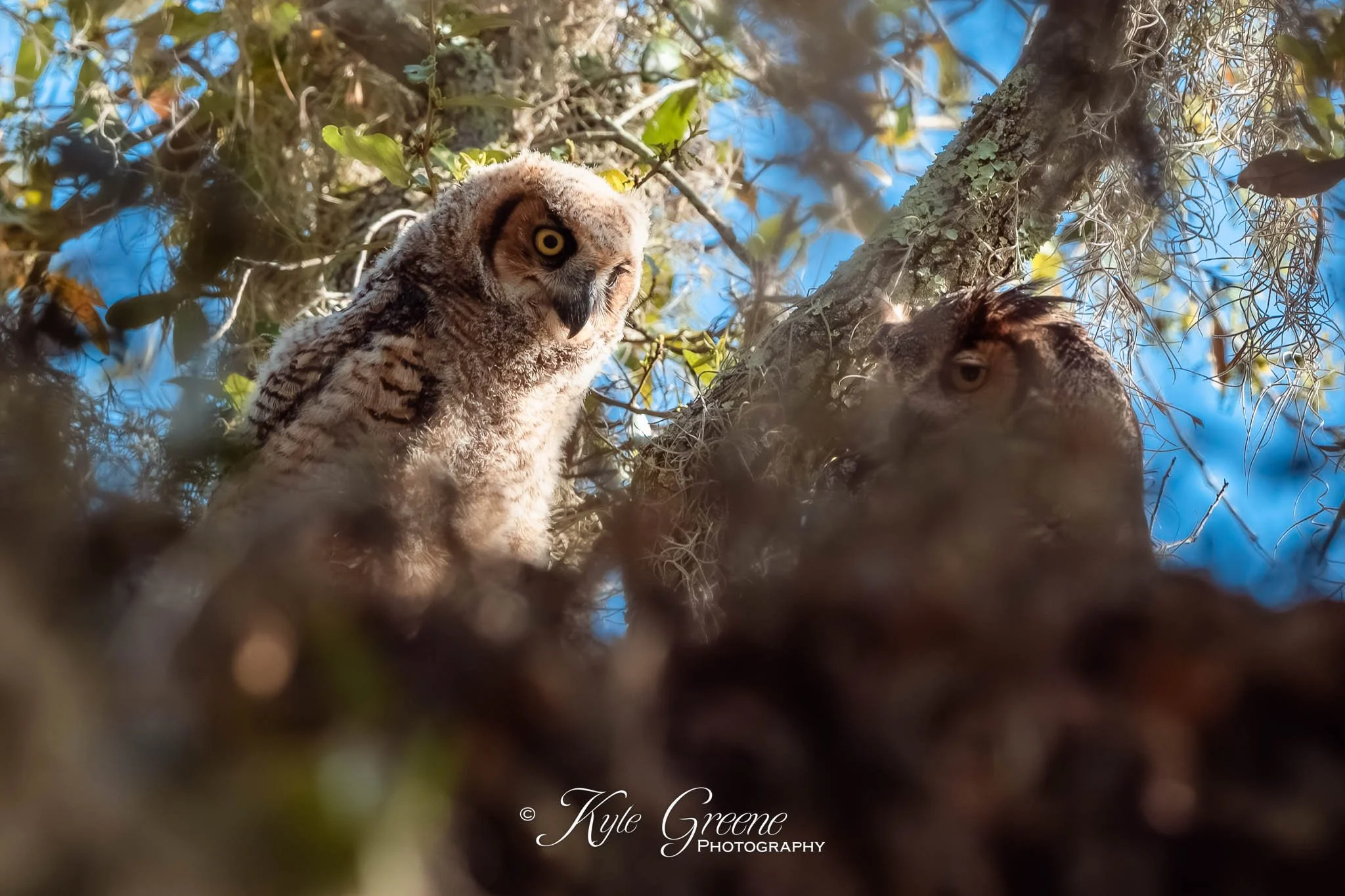 Baby Great Horned Owl with mom sitting right there in the shadows