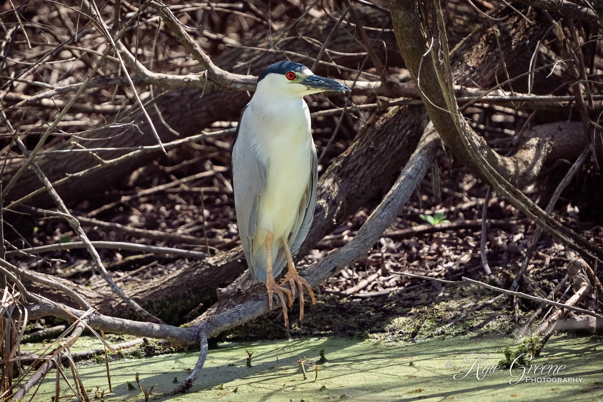 Black Crowned Night Heron in the brush just above the water