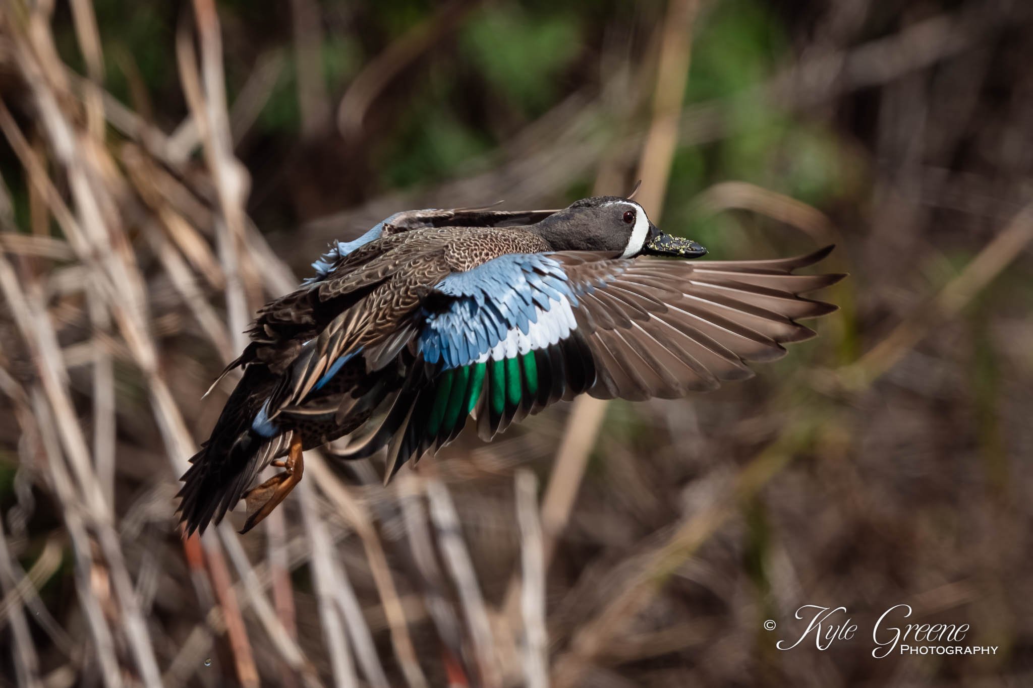 Male Blue winged Teal flying past