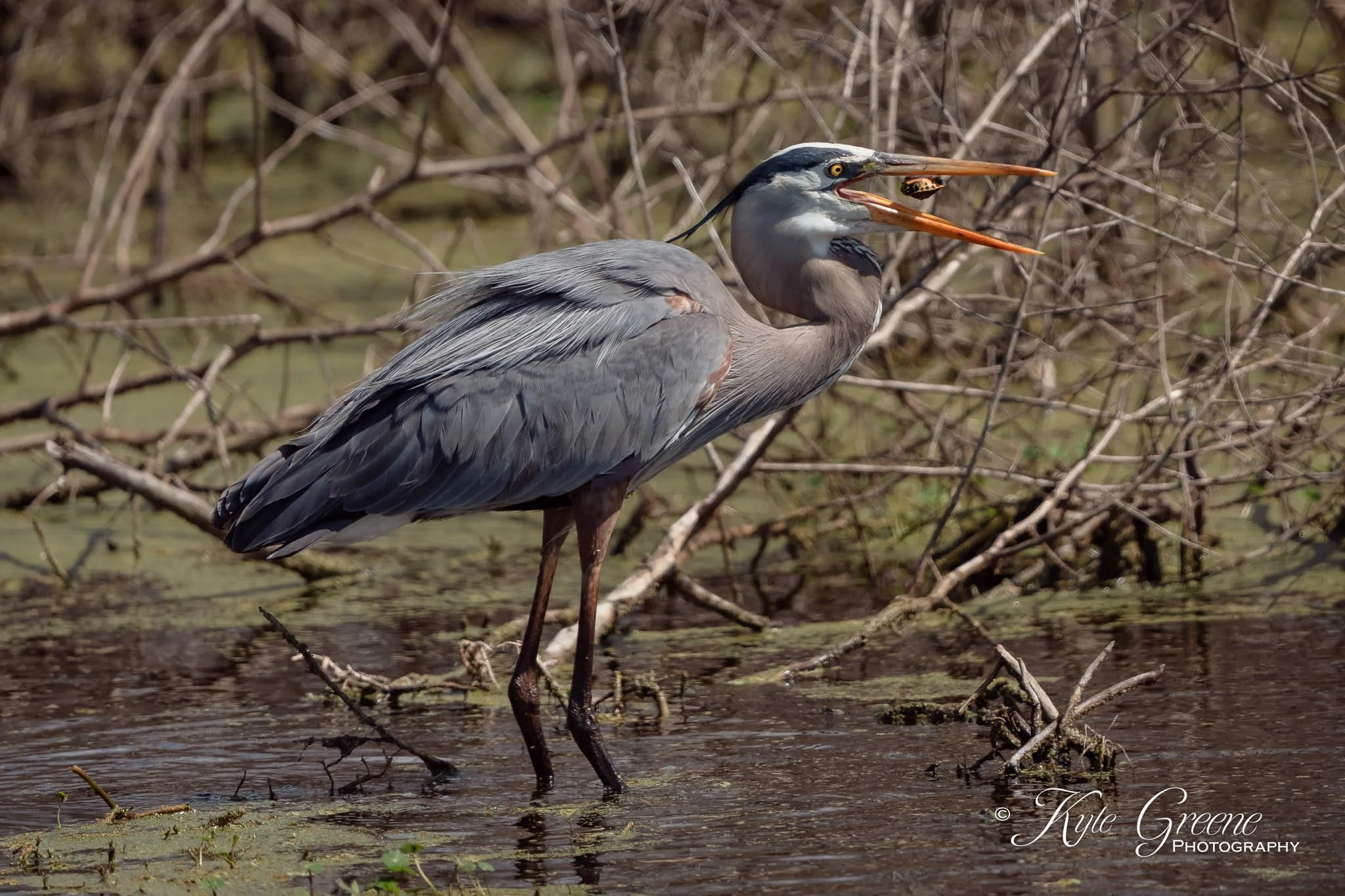 Great Blue Heron flipping a tiny turtle snack